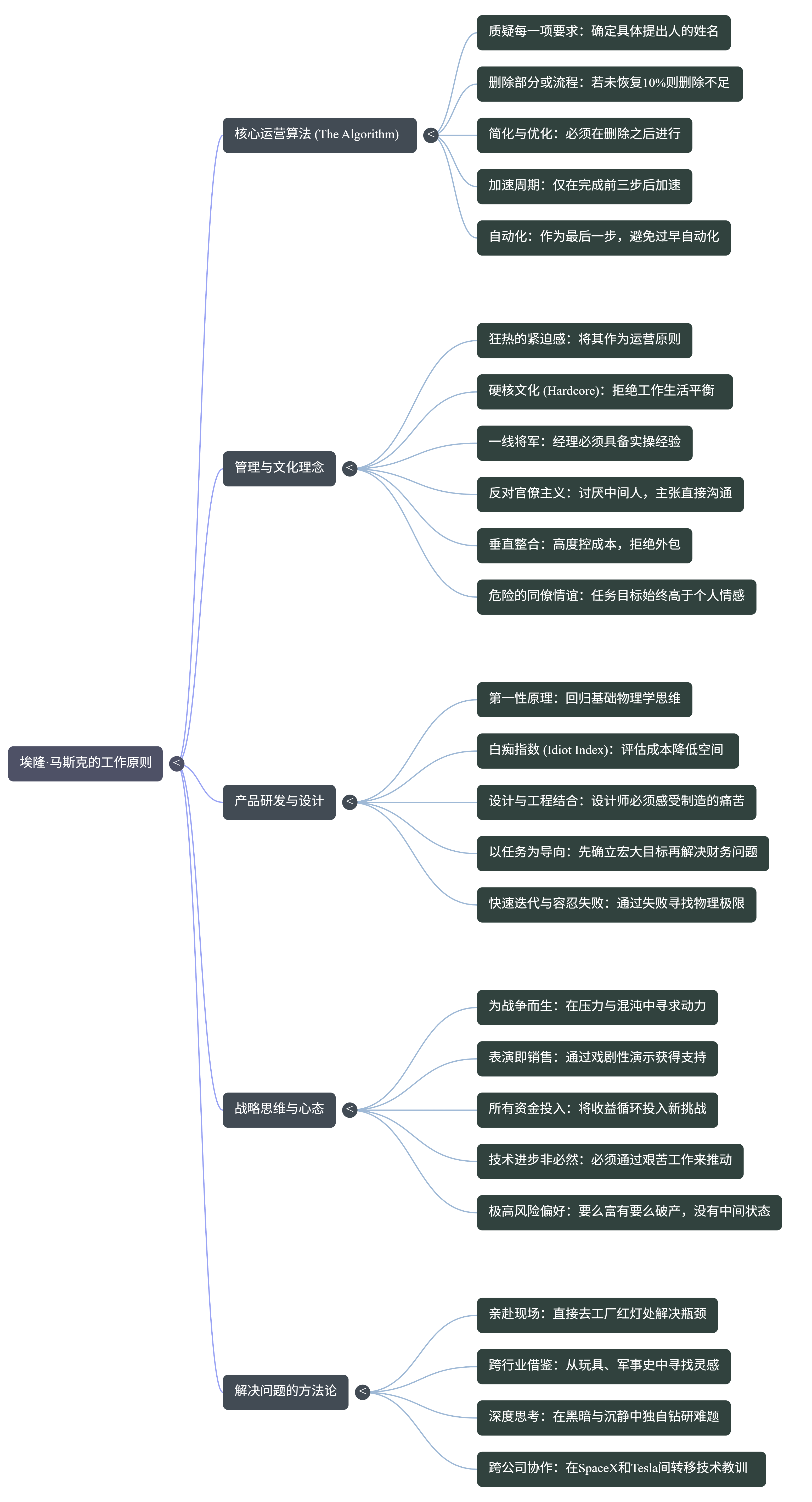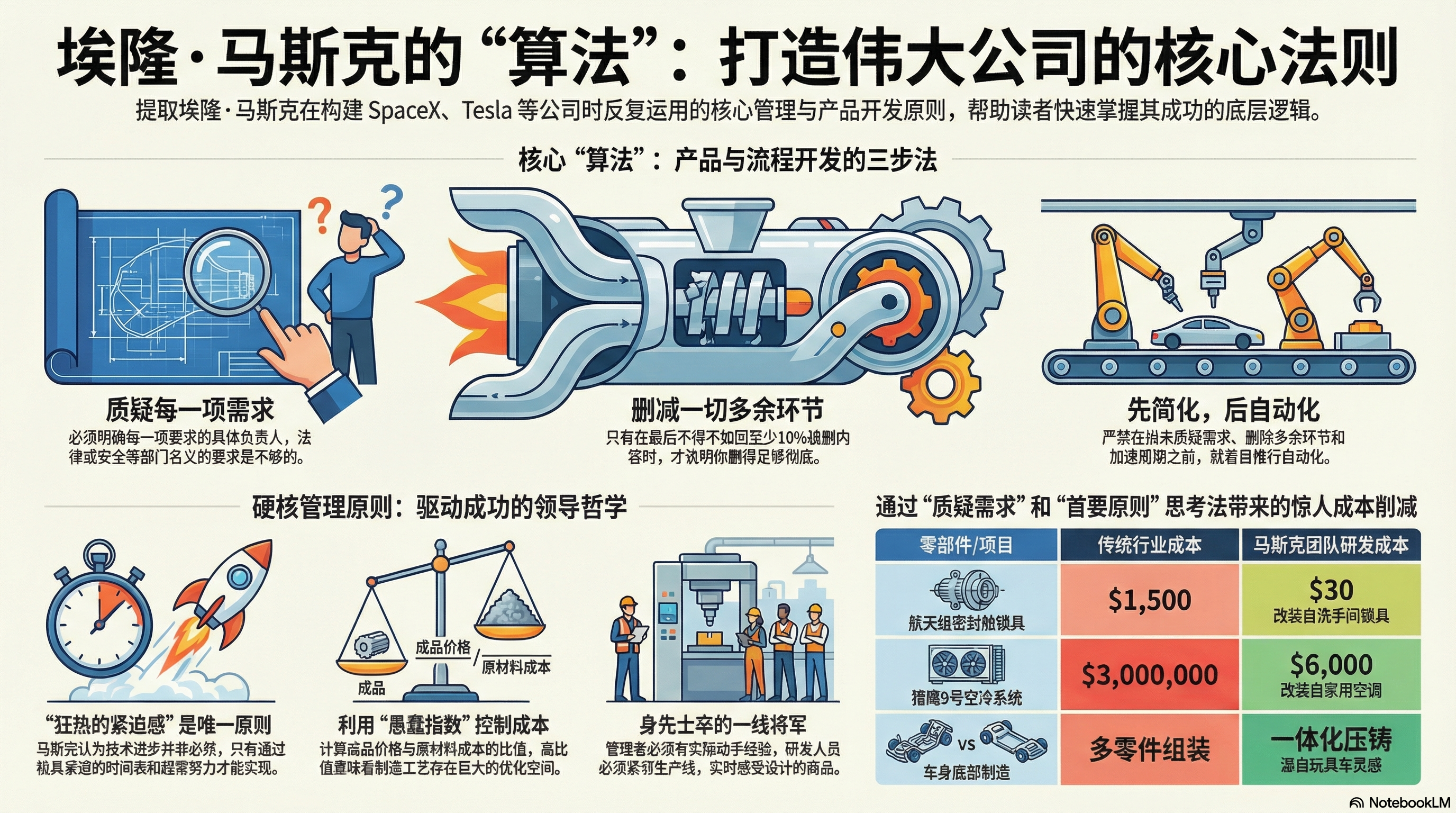 为了对抗困扰现代制造业的制度惯性,马斯克采用了一套严格的五点检查清单,称之为“算法”。他坚持要求必须严格按照这些步骤进行操作。他认为,领导者可能犯下的最灾难性的错误就是“优化一个本不应该存在的流程”。